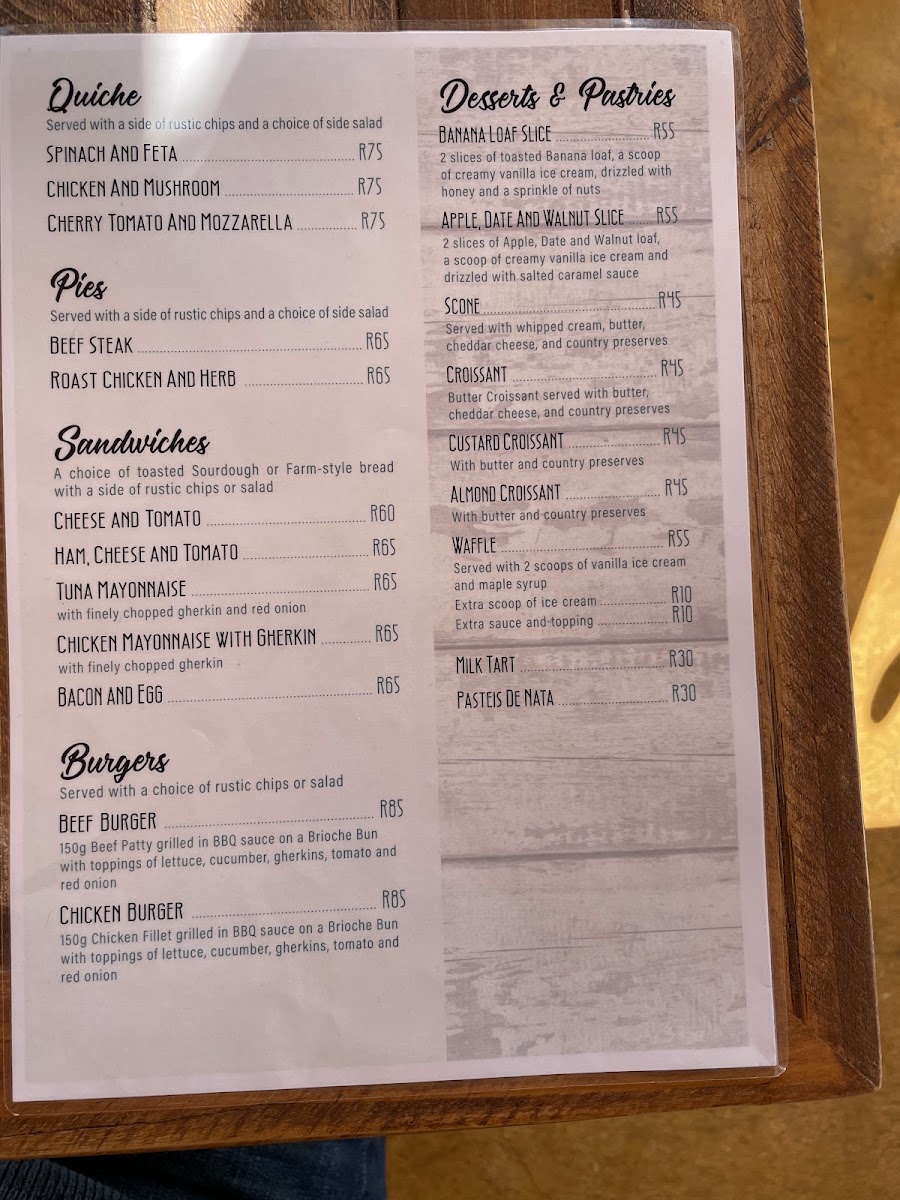 - Notable Dishes: Quiche, Chicken and Beef Pies, Salted Caramel Shake